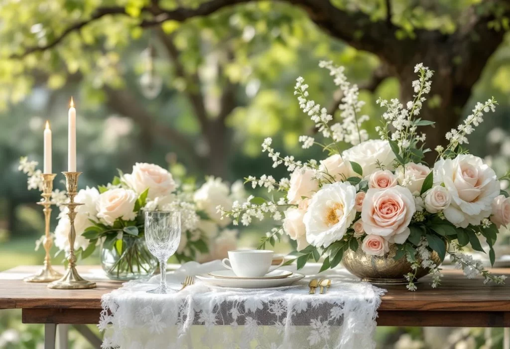 La déco mariage façon gatsby mise avant tout sur la profusion. On multiplie sans hésiter les objets brillants : vases en cristal, confettis dorés, chemins de table irisés. Les centres de table prennent de la hauteur grâce à de grands bouquets soulignés de plumes blanches ou noires. L’art déco s’exprime aussi par l’usage immodéré de formes symétriques et de couleurs riches (or, noir, blanc).